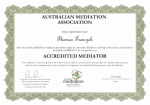 • seit 2011 AMA NMAS Mediator Accreditation (Australien), 2025 Re-Akkreditierung Australian Mediator and Dispute Resolution Accreditation Standards (AMDRAS)